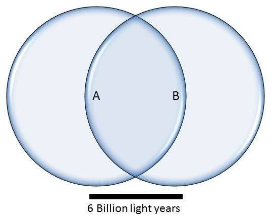 My confusion lies in the statement "Observers A and B see each other and have overlapping horizons. Suppose A and B are separated by a distance of 6 billion light years."