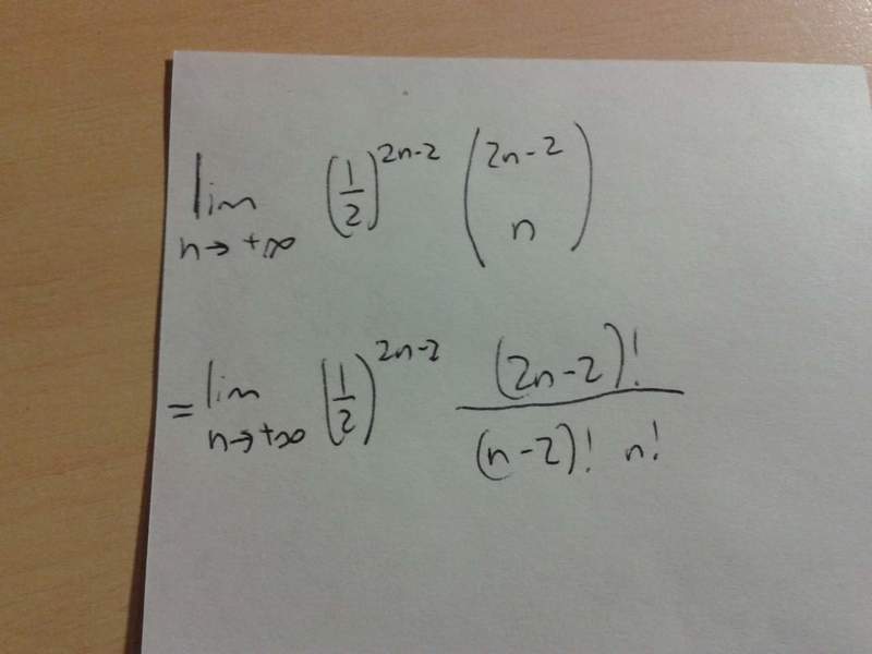 tt2348 said:Actually, i think this problem can be done without stirrings. For the top factorial, you have (2n-2) terms, giving a leading term of (2n)^(2n-2) for the expansion. Then the bottom will have (n^(n-2)+...)(n^n+...), giving a leading coefficient n^(2n-2)... This your limit becomes (2n-2)!/(2^(2n-2)*n!*n-2!)~O(2^(2n-2)*n^(2n-2)/(2^(2n-2)*n^(2n-2))~1
