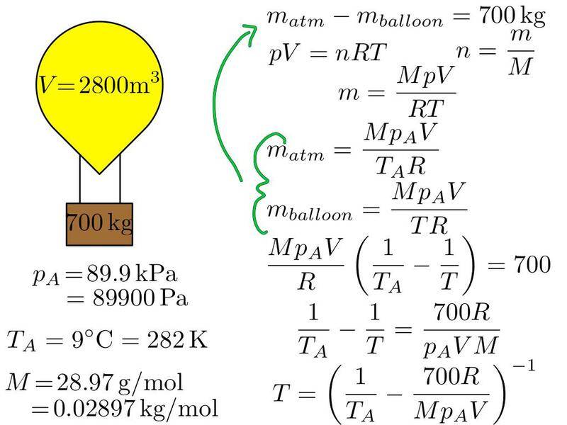 - A hot air balloon of mass 350kg is carrying 5 people each of mass 70kg. The total volume of the balloon is 2800m[SUP]3[/SUP]. The balloon flies horizontally in dry air 1km above sea level. The atmospheric pressure at this altitude is 89.9kPa and the surrounding temperature is 9∘C. Given that the molar mass of dry air is 28.97g/mol, work out the temperature of the heated air inside the balloon. (You can take gas constant R=8.31J/mol K and you may assume that air behaves as an ideal gas).