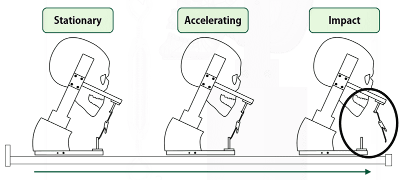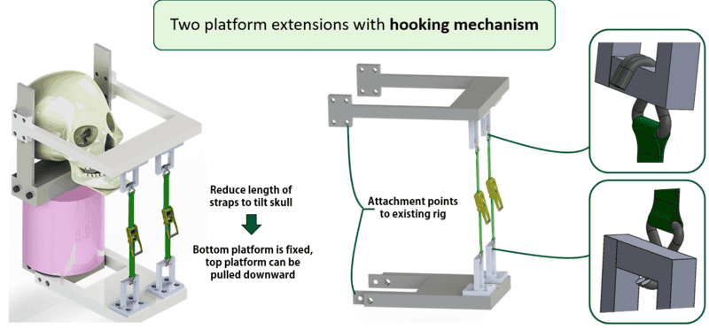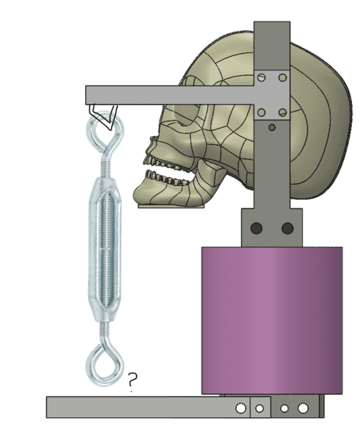 The idea as shown in Picture 2, is that the model could pre-set to an angle, where it accelerates down a track using a pneumatic actuator and the force of the sudden stop at the end of the track would blow the bottom hooks off their anchor point. This would release all the tension in the straps, meaning the skull could whiplash freely mimicking a concussion.