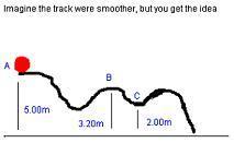 A bead of mass m=5.00kg is released from point A and slides on the frictionless track shown in figure P5.30. Determine (a) the bead's speed at points B and C and (b) the net work done by the force of gravity in moving the bead from A to C.