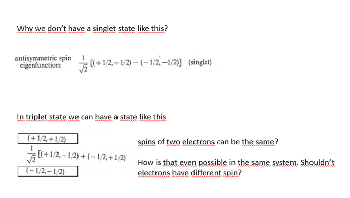 Edge5 said:Hello, I don't understand how can electrons in triplet state can have the same value of spin? Shouldn't the spins be different because two fermions can't have the same state?