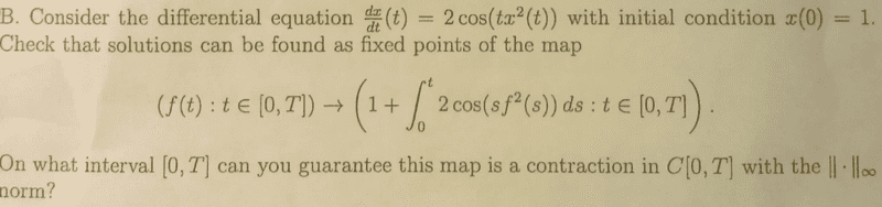 \Theta(f):[0,T]\rightarrow \mathbb{R}:t\rightarrow\ 1+\int_0^t 2\cos(sf^2(s))ds<br /> <br /> Strictly speaking, you first need to check that \Theta(f) is in fact continuous before you can say that the codomain of \Theta is \mathcal{C}([0,T],\mathbb{R}).<br /> <br /> Now, you need to find out when \Theta is a contraction. Can you tell us what that means??<br /> <br /> Also, here is a LaTeX guide on how to post mathematical equations: <a href="https://www.physicsforums.com/showpost.php?p=3977517&amp;postcount=3" class="link link--internal">https://www.physicsforums.com/showpost.php?p=3977517&amp;postcount=3</a> It would help us a lot if you would use this to make your equations more readable.