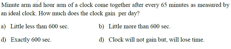 I usually have trouble with these clock problems . In this problem I can certainly rule out option d) . I considered a simple situation in which initially the clock is at 12' o clock . After 65 minutes , the minute hand would be at 1'o clock mark wheras the hour hand would be somewhere between 1 and 2 . This means when the two hands meet the actual time elapsed should be more than 65 minutes .