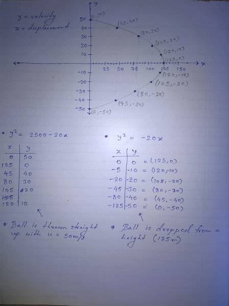 I'm a school going student, and this is my first post here. I'm having problems drawing v vs x graphs. I'm unable to understand what should be my general approach while trying to draw v-x graphs. (I've no problem drawing x-t, v-t, or a-t graphs). Let's say, for example, a ball is thrown up with some initial velocity 'u = 50m/s', it keeps going up until it's velocity becomes zero. So I put the values in 3rd eqn of motion. And this is the equation I end up with : y² = 2500 - 20x