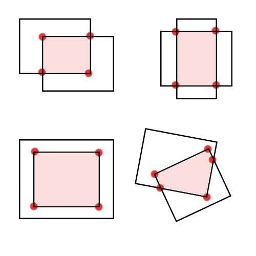 This seems to work for very simple cases, but like I said, it (a) does not factor in rotation, nor (b) consider when the union is a 5-sided polygon (see last example,in image).