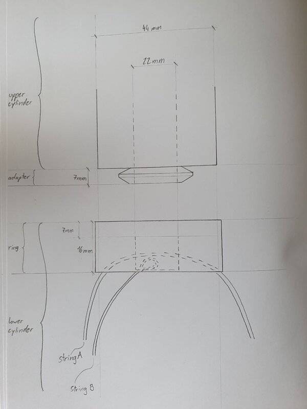 I’m trying to build a coupling system between two cylinders to connect them coaxially and transfer pulling force from a string on the surface of cylinder one to a string inside cylinder two. Please have a look at the sketches attached. Both of the cylinders have an outer diameter of 44mm and the upper one is hollow with an inner diameter of 22mm. On top of the lower cylinder sits a clutch which consists of a turnable ring and some elements which slide in and out radially. By turning the ring 60 degrees either clockwise or counter clockwise an adapter which sits on the upper cylinder gets stuck in the clutch. So there is one open position of the ring/clutch at 0° and two closed positions at -60° and 60°. Until here everything works fine.