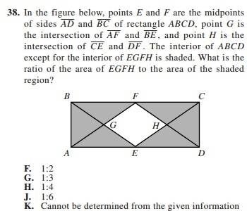 The discussion focuses on determining the ratio of the white area to the shaded area in a rectangle divided by midpoints, concluding that the ratio is 1:3. The method involves drawing a line between points E and F, which splits the rectangle into two equal parts, each containing four triangles. The calculations demonstrate that the white area constitutes 1/4 of the rectangle, while the shaded area makes up 3/4, leading to the established ratio of 1:3.