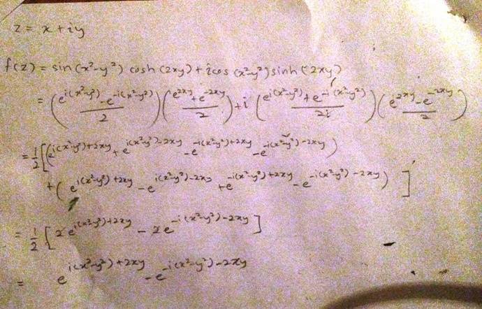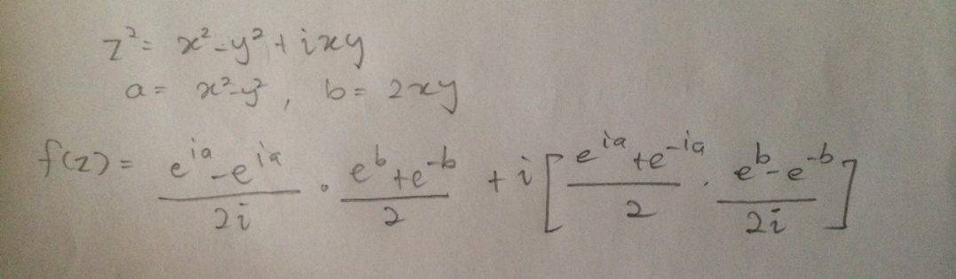 The discussion centers on expressing the function f(z) in terms of z using exponentials. The user successfully derives that if z = x + iy, then z² = x² - y² + i(2xy), leading to the conclusion that f(z) = sin(z²). The user also notes that this method is faster than using exponentials but seeks clarification on how to express the function using exponentials. The relevant identities for sine involving complex numbers are highlighted, specifically sin(X + iY) = sin(X)cosh(Y) + i cos(X)sinh(Y).