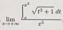 The problem involves finding the limit as x approaches positive infinity of the expression (integral from x to x^2 of (sqrt(t^3+1)dt))/x^5. The subject area pertains to calculus, specifically the evaluation of limits involving integrals.