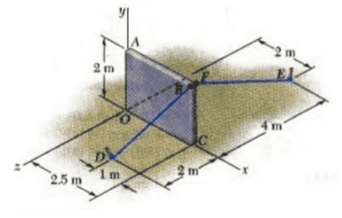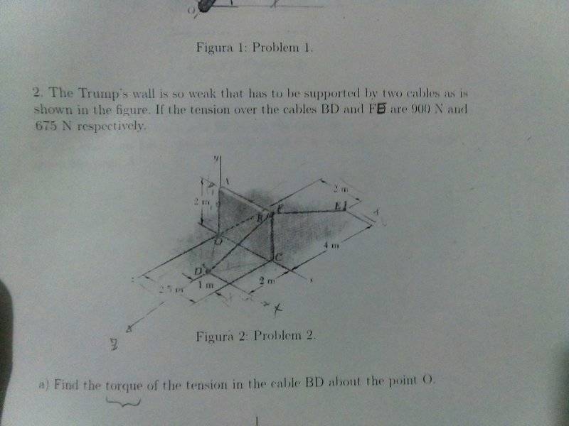 The Trump's wall is so weak that has to be supported by two cables as is shown in the figure. If the tension over the cables BD and FE are 900 N and 675 N respectively.