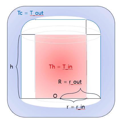 - What needs to be obtained is the temperature distribution of thermos that have reached thermal equilibrium. The thermos consists of three parts. The 'pillar' is a hollow cylinder whose inner radius is R_in and outside radius is R_out, height h. The 'lid border' is a solid of revolution made by rotating a quadrant with a radius of R_out - R_in. The 'lid center' is a cylinder, the radius and the height is R_out - R_in. The 'lid border' is placed on the 'pillar', and 'lid center' occupies the inside of the 'lid center'. The surface of the thermos is in contact with two heat sources. First, the high heat source which has a temperature of Th covers the inside. Next, the low heat source which has a temperature or Tl covers the outside except the bottom of the thermos. And the bottom of the 'pillar' is insulated.