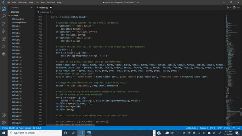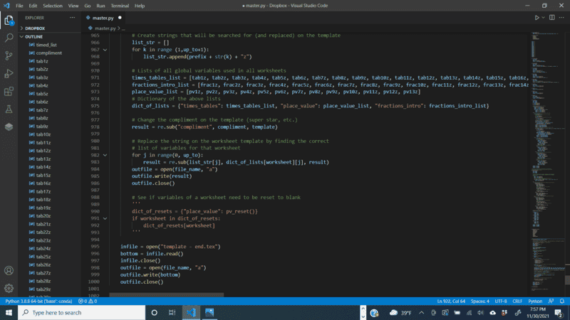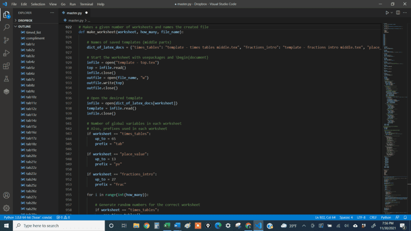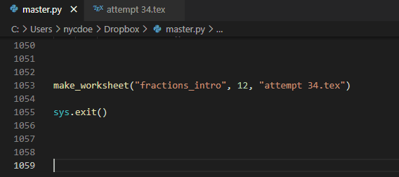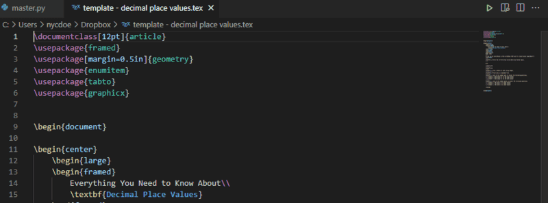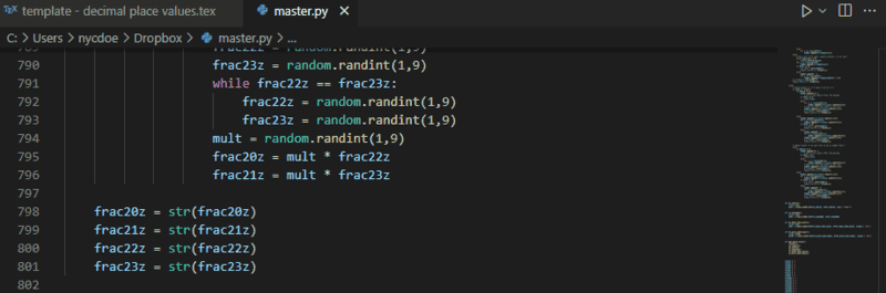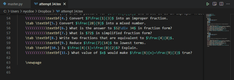 It is also exhibiting strange behavior. The project I am working on involves creating multiple versions of math worksheets on various topics for my students. I have a bunch of latex worksheet templates and a "master" python file which reads the latex templates and then writes a new file with different numbers for each problem. Everything was working fine until recently. Now, when I run the master python file, it might work a couple times but eventually it stops working and clicking on the white run button does nothing.
