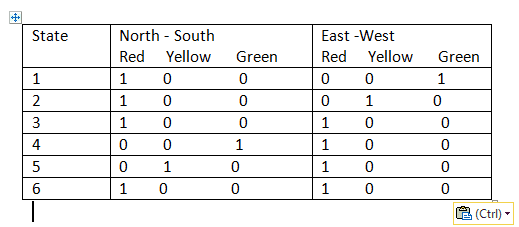 2) If a North-south pedestrian is detected then the lights will cycle in a similar fashion but the appropriate walk light will be displayed for a short interval when cycling to Green.