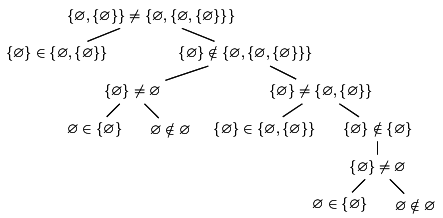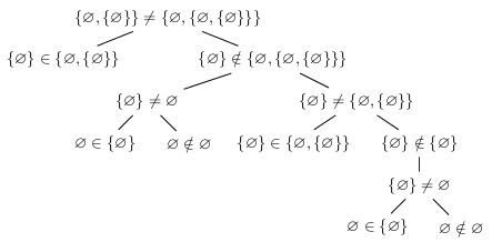 It has three layers where one needs to prove inequality, and all of them are proven in the same way: by showing some element of one set that does not belong to the other.