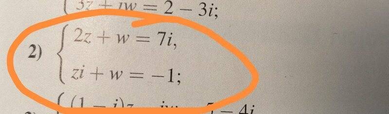 Edit: also, I've tried, multiplying lower eq. with -1 so that I can cancel w but I get stuck with 2z and zi and I can't figure out what I am supposed to do with that.