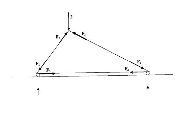 A weight of 2 T is supported by a three bar truss. We want to find the forces in the three bars.