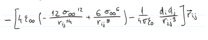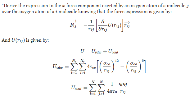 - Derive the expression to the x force component exerted by an oxygen atom of a molecule j over the oxygen atom of a i molecule knowing that the force expression is given by (equation on attempt at a solution)