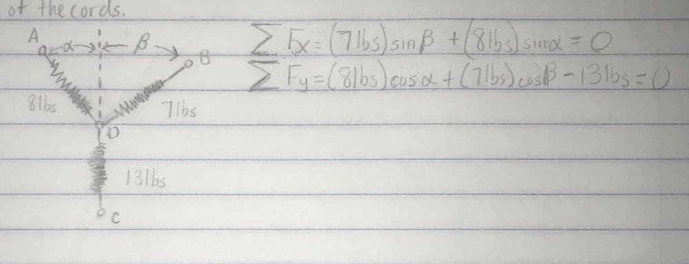 ##\sum F_{y}=(8 lbs)cos\alpha+(7 lbs)cos\beta-13 lbs=0##