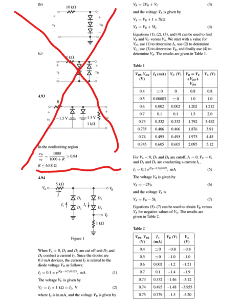 The discussion revolves around understanding a homework problem related to diodes in an electronics context. Participants are attempting to clarify the solution provided in a manual, particularly focusing on the diode equation and the expected output voltages in different scenarios involving diode conduction.