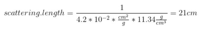 I suppose scattering length= 1/(4.2e-2 cm2/g * 11.34 g/cc)=21cm