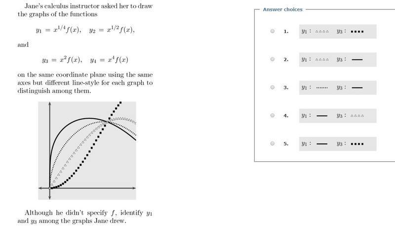 Jane's calculus instructor asked her to draw the graphs of the functions y1 = x1/4f(x), y2 = x1/2f(x), y3 = x2f(x), and y4 = x4f(x) on the same coordinate plane using the same axes but different line-style for each graph to distinguish among them. Although he didn't specify f, identify y1 and y3 among the graphs Jane drew. I have attached the picture for this problem.