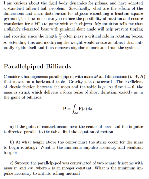 The discussion centers on the innovative concept of integrating rectangular prisms into billiards, enhancing the traditional gameplay. Participants express enthusiasm for the potential challenges posed by calculating angles and trajectories when balls interact with the prisms. Suggestions include using the prisms as pockets or obstacles, which would necessitate strategic thinking and precise aiming. The idea of varying sizes and shapes of prisms is also highlighted as a way to increase complexity and excitement in the game.