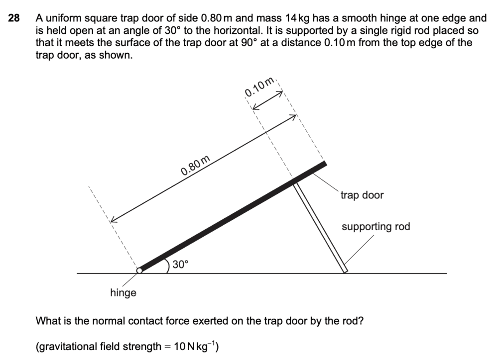 - A uniform square trap door of side 0.80 m and mass 14kg has a smooth hinge at one edge and