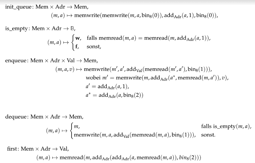 For each memory $m \in \text{Mem}$, each address $a \in \text{Adr}$ and each value $v \in \text{Val}$, the init_queue(m, a) initializes a queue at $a$ in $m$, is_empty(m, a) checks if the queue at $a$ in $m$ is empty or not, enqueue(m, a, v) places the value $v$ in the queue at $a$ in $m$, dequeue(m, a) takes the oldest value from the queue at $a$ in $m$ and first(m, a) gives the oldest value of the queue at $a$ in $m$. Let $m\in \text{Mem}$ and $a = \text{bin}_{32}(0)$. I want to compute the value of