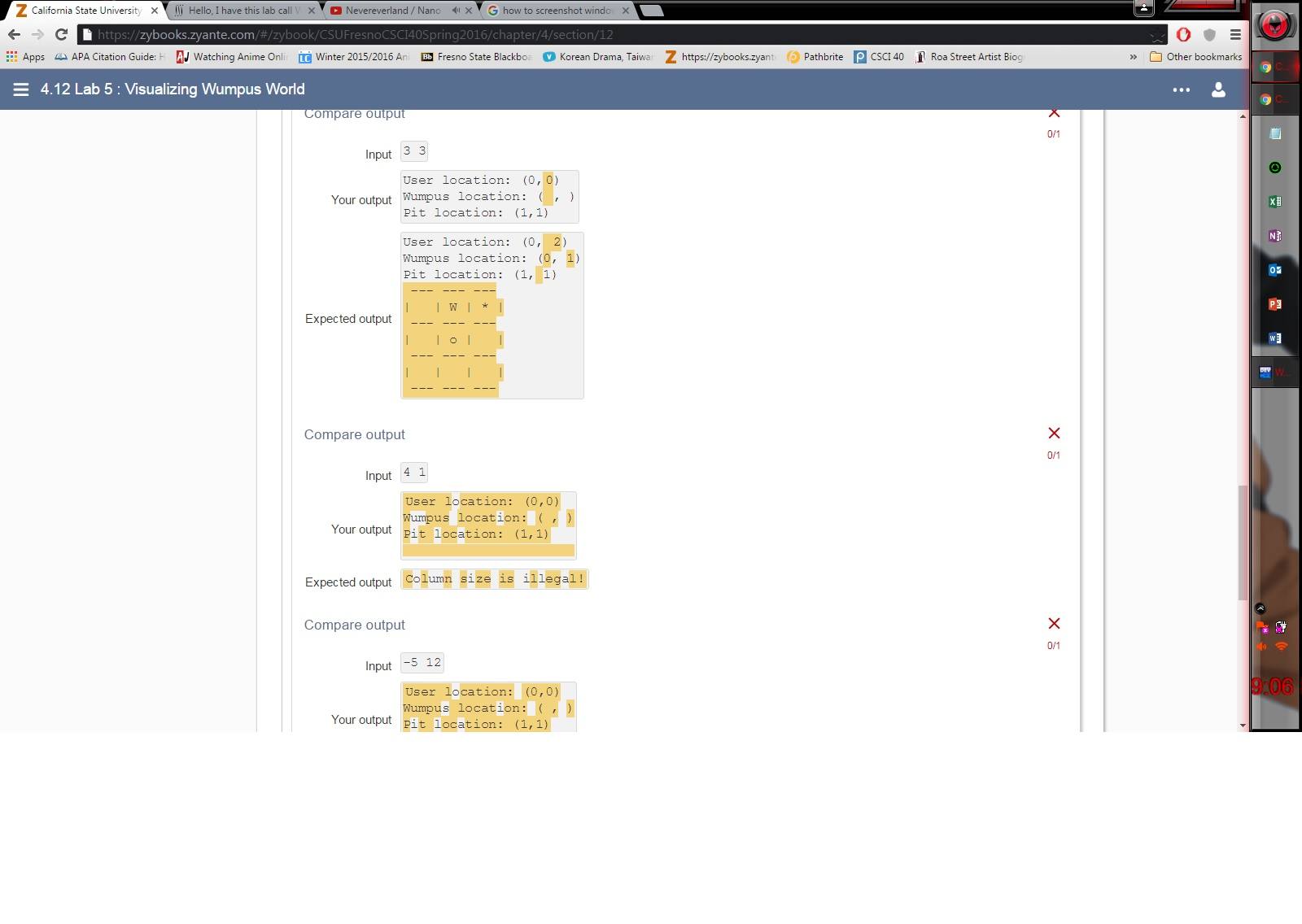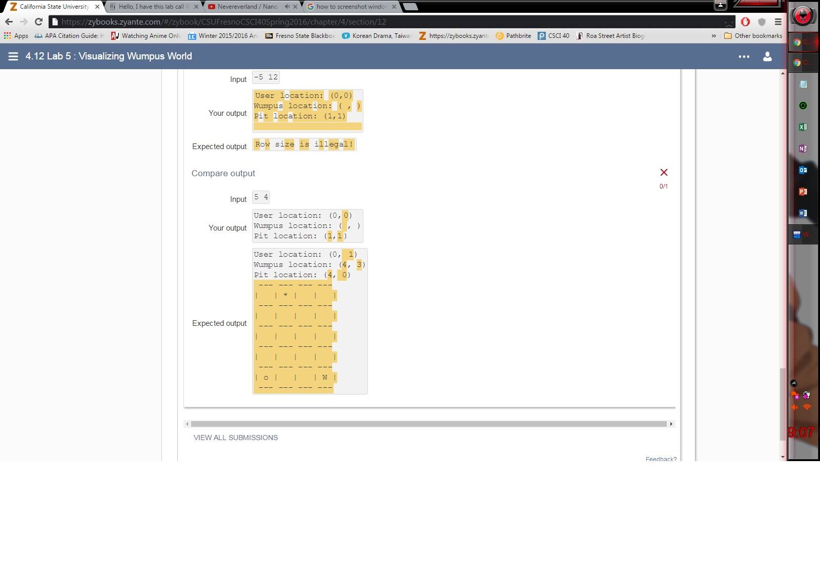 3.) You are probably wondering what in the world is a wumpus. A wumpus is a monster that will devour the poor user! Of course, at the moment, Wumpus World does not actually contain a wumpus. So let's change that! Generate a random location on the grid for the wumpus. The user and the wumpus cannot start at the same location. You will output this location in the form "Wumpus location: (i, j)". For output, use 'W' to represent the wumpus' location.