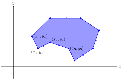 \[A(R)=\frac{1}{2}\left(\begin{vmatrix}x_1 & x_2\\ y_1 & y_2\end{vmatrix}+\begin{vmatrix}x_2 & x_3\\ y_2 & y_3\end{vmatrix}+\cdots+\begin{vmatrix}x_{n-1} & x_n\\ y_{n-1} & y_n\end{vmatrix}+\begin{vmatrix}x_n & x_1\\ y_n & y_1\end{vmatrix}\right)\]