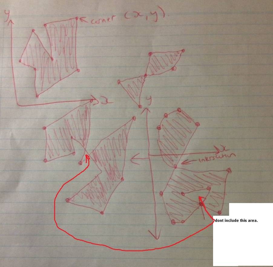 I have been given various corners which are x and y coordinates for a shape. The coordinates are listed in a vector e.g. xpoints = [x1, x2, x3, …, xn, x1] and ypoints = [y1, y2, y3, …, yn, y1] so that corner 1 would be (x1,y2) and corner n would be (xn, yn). I have listed the first point last so that I can calculate the distance between each point in the shape when using the distance equation. These distances added up will give the perimeter. These points could be anything. The lines made between each point are straight. I was wondering is there a way where I could calculate the total area roughly. I don’t think I could integrate it as I don’t have a function for the shape. I was thinking maybe since all of the lines are straight maybe triangles could be used? Note this is for a programming assignment but is there a mathematical method anyone could think of which I could use to approach this. The picture shows examples of possible areas. Also note the points can be negative to. Also is there any way some could think of only calculating the shaded area. See picture for reference. It include possible shapes.