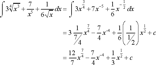##\int 3x^\frac{3}{4}+7x^{-5}+\frac{1}{6}x^{-\frac{1}{2}}\ dx=\int 3x^\frac{3}{4}\ dx+\int 7x^{-5}\ dx+\int \frac{1}{6}x^{-\frac{1}{2}}\ dx## using the sum rule for integrals##\int 3x^\frac{3}{4}\ dx+\int 7x^{-5}\ dx+\int \frac{1}{6}x^{-\frac{1}{2}}\ dx=3\int x^\frac{3}{4}\ dx+7\int x^{-5}\ dx+\frac{1}{6}\int x^{-\frac{1}{2}}\ dx## using the constant multiple rule for integrals##3\int x^\frac{3}{4}\ dx+7\int x^{-5}\ dx+\frac{1}{6}\int x^{-\frac{1}{2}}\ dx=3\cdot\frac{1}{\frac{3}{4}+1} x^{\frac{3}{4}+1}+7\cdot\frac{1}{-5+1}x^{-5+1}+\frac{1}{6}\cdot\frac{1}{-\frac{1}{2}+1} x^{-\frac{1}{2}+1}+c## using the integral formula ##\int x^\alpha\ dx=\frac{1}{a+1}x^{\alpha+1}+c## when ##\alpha\neq-1##
