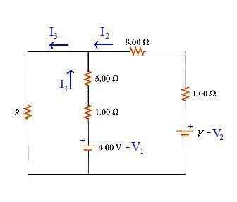 Determine the current in each branch of the circuit where R = 14.00 Ω, and V = 20.0 V.