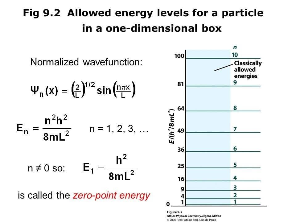 - Energy of particles in a 1D box = n^2 h^2/ (8mL^2)