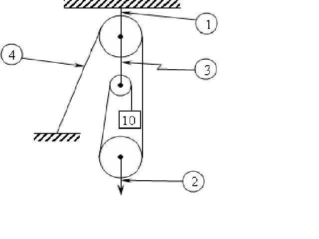 Given a block and tackle system and a known weigt, give the magnitude of the forces at the numbered points. [see attached for figure]
