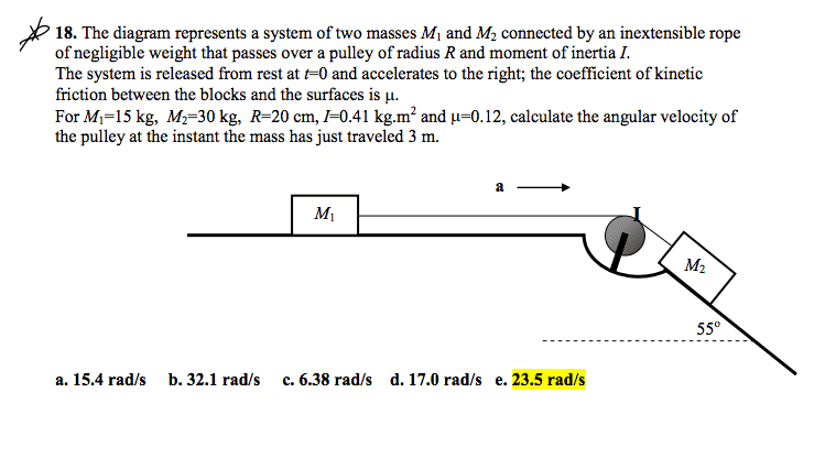 I used the force equation for M1 and M2. So Fx for M1: Fx= T-um1g=m1a. Fx for M2: Fx= m2gsin(theta)-T-um2gcos(theta)=m2a. Since the 2 accelerations are the same, I used the 2 equations to solve for a and i got a value of 5.415m/s^2. Angular acceleration is equal to a/r so i did 5.415/0.20= 27.075. Since angular speed should be angular acceleration multiplied by time, I found time by using the xf=3=1/at^2, where I got t= 1.05s. When I multiply the values, I get 28.5. What am I doing wrong?I have my exam tomorrow so I would really appreciate it if someone can help me before thent!