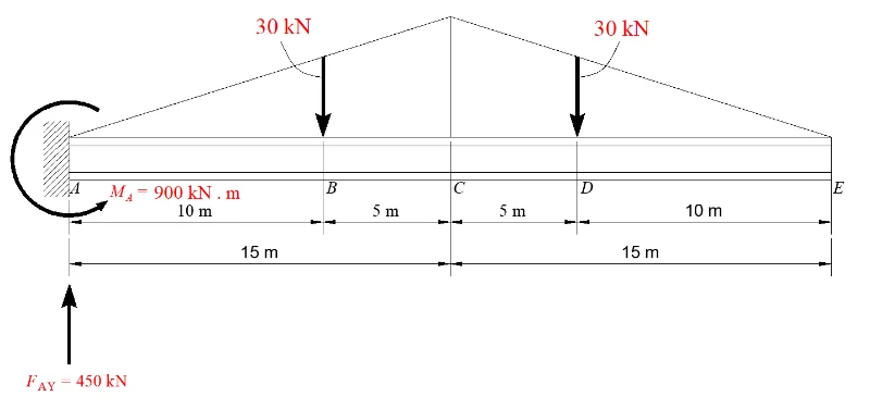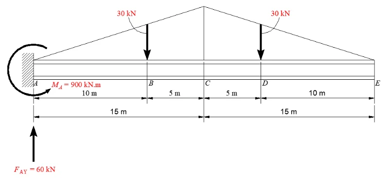 - A detailed explanation is provided regarding the behavior of moments and shear forces at different cross-sections of the beam.