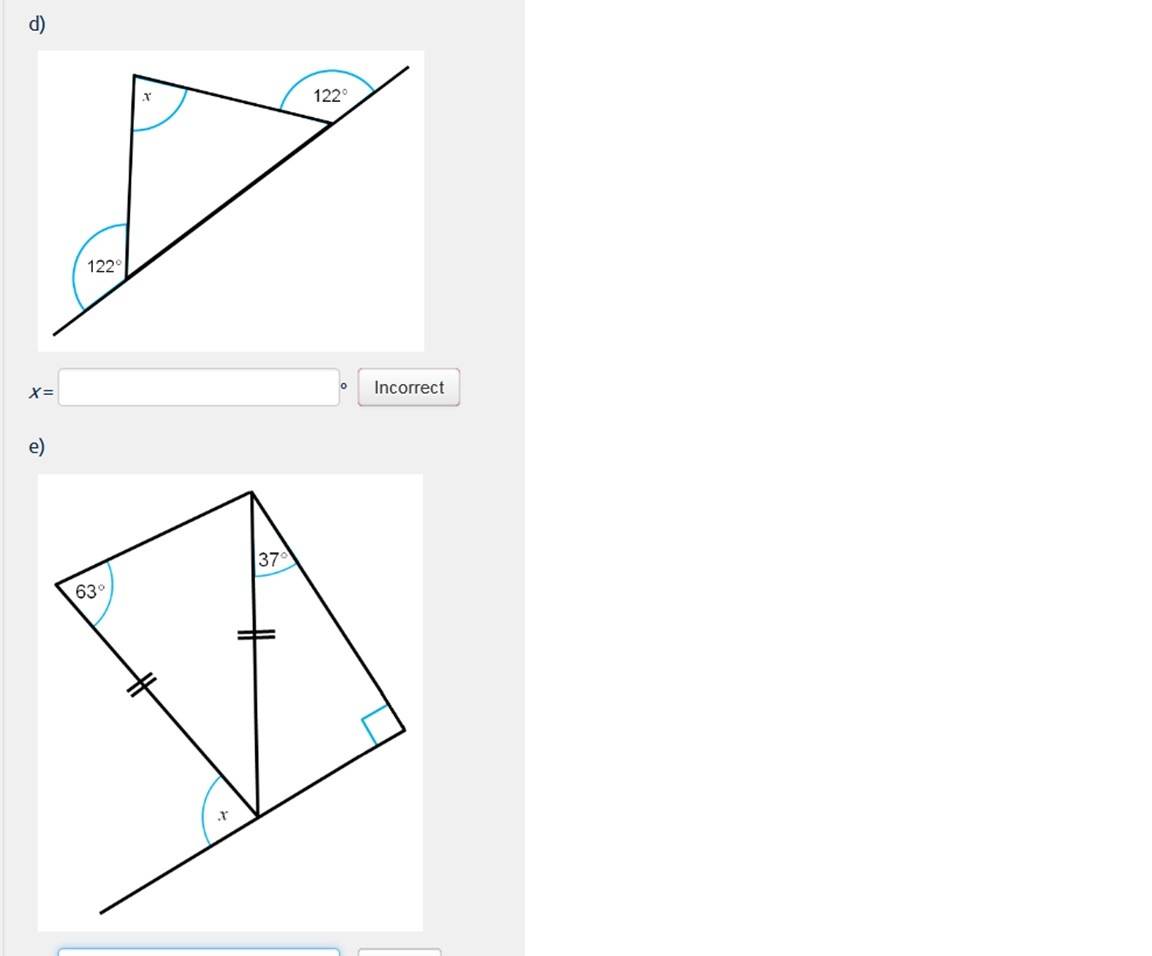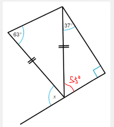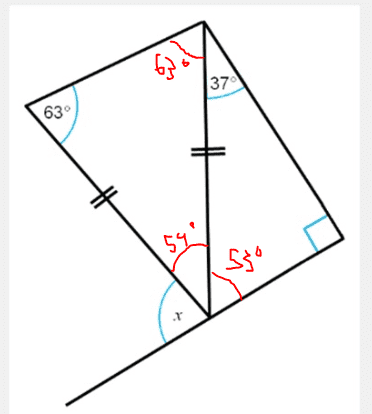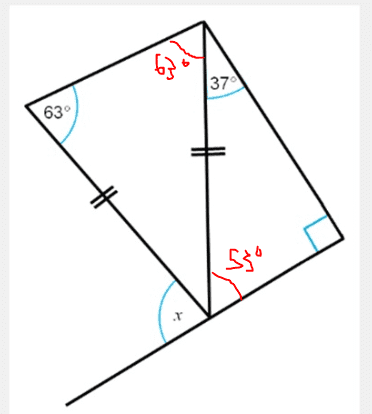 Now, move on to the second triangle. Use the fact that this triangle is isosceles, and therefor its base angles are the same. This means that the other base angle also has a measure of 63 degrees.