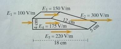 Let a=4cm and b=5cm. The total flux in is then abE_1 and flux out is abE_2. Applying Gauss' law then gives the total enclosed charge as Q=ab\epsilon_0(E_2-E_1).