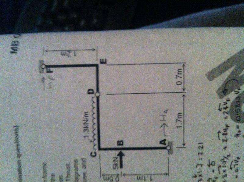 The discussion focuses on determining the direction of horizontal reaction forces in a 3-pin frame analysis. The user initially struggled with labeling the horizontal reactions HA and HF, believing they should oppose applied forces. However, it was clarified that if both forces are drawn in the same direction, they act to the right. The user successfully resolved their problem after understanding the correct labeling of these forces.