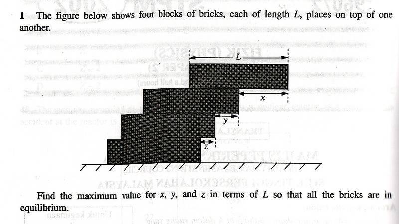 So the x-component (see sketch below) of the center of mass of a bunch of blocks must be on the edge of the block below (acutally an infinitesimal piece forward the edge, to be in stable equilibrium, otherwise the "point mass" falls down!)