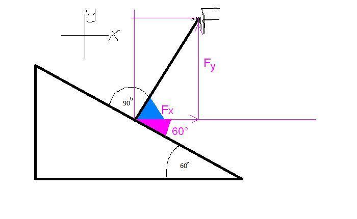 The discussion focuses on the process of splitting a force vector into its x and y components in the context of inclined planes and centripetal acceleration. The user struggles with understanding how to apply the 60-degree angle to determine these components. It is established that the force vector makes a 90-degree angle with the slope, and through vector addition, the blue angle is identified as 30 degrees. This geometric relationship is crucial for solving the problem effectively.