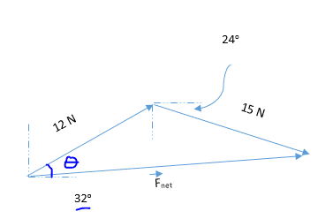 The discussion revolves around the application of the tip-to-tail method for vector addition and the calculation of net force. Participants are exploring the relationships between angles and forces in a physics context, specifically involving vector components and resultant forces.