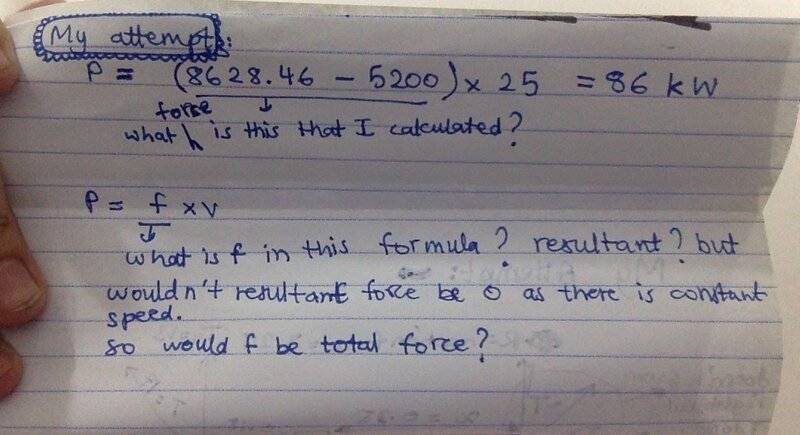 ok so in p=fvharuspex said:The F you need to use in P=Fv is the motive force delivered by the engine. This has to balance the opposing forces, the 5200N of resistance plus the gravitational component.