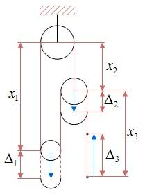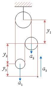 $$\left\{\begin{array}{l} (1)~a_3=2a_2+2a_1 \\ (2)~2T_3+m_2g-T_3=m_2a_2 \\ (3)~m_1g-2T_3=m_1a_1 \\ (4)~ T_3-m_3g=m_3a_3 \end{array}\right.$$