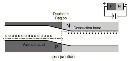 - chemical potential drives n-type electrons to diffuse into the p-type region, leaving the n-type semiconductor positive and the p-type semiconductor negative, forming a dipole between the two types across a region over the junction called the depletion zone.