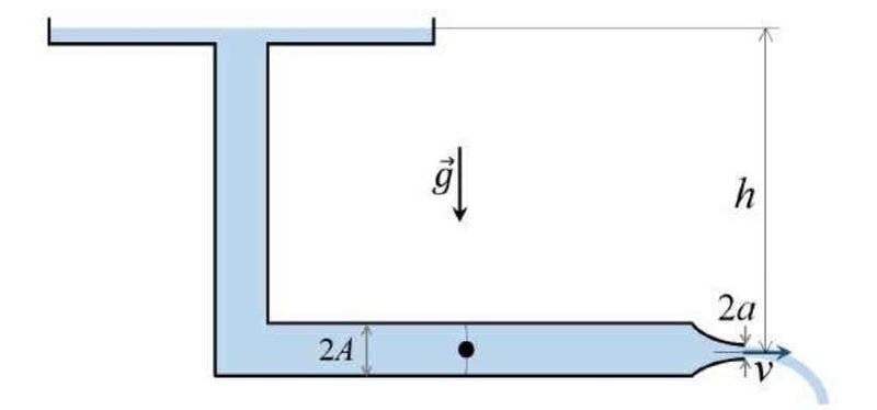 much greater than that of the tube considered above. The fluid discharges outwards through the tube (therefore, with an L shape) exiting from a circular opening of radius ##a < A## located at a distance ##h## below the level of the fluid in the container. (So, the total thickness of the tube is ##2A## and the total length of the opening is ##2a##).