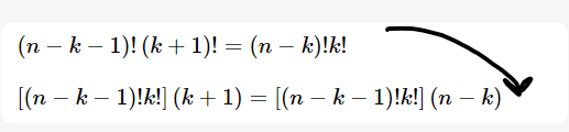 The discussion revolves around understanding factorial equations, particularly in the context of binomial coefficients and their relationships. Participants are exploring how to manipulate and interpret expressions involving factorials, specifically relating to the equation \(\binom{n}{k} = \binom{n}{k+1}\).