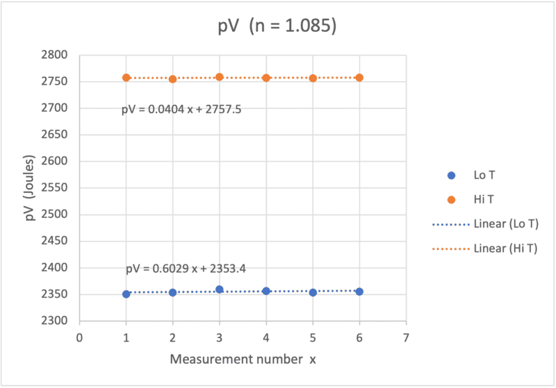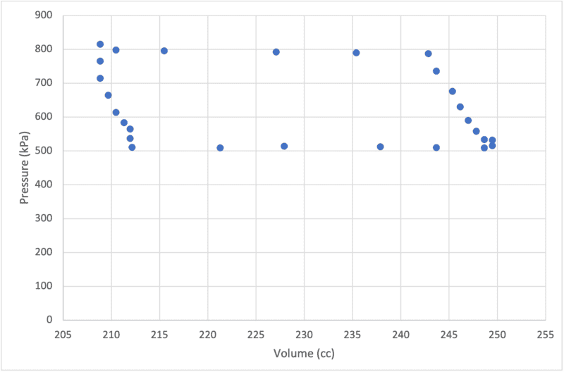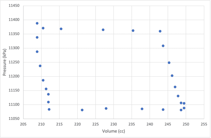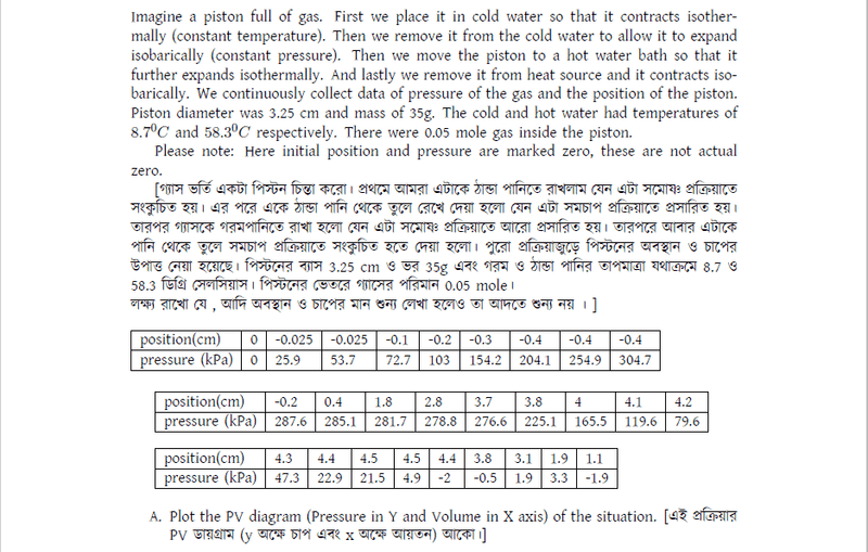 - Imagine a piston full of gas. First we place it in cold water so that it contracts isothermally (constant temperature). Then we remove it from the cold water to allow it to expand isobarically (constant pressure). Then we move the piston to a hot water bath so that it further expands isothermally. And lastly we remove it from heat source and it contracts isobarically. We continuously collect data of pressure of the gas and the position of the piston. Piston diameter was 3.25 cm and mass of 35g. The cold and hot water had temperatures of 8.7°C and 58.3°C respectively. There were 0.05 mole gas inside the piston. Please note: Here initial position and pressure are marked zero, these are not actual zero.